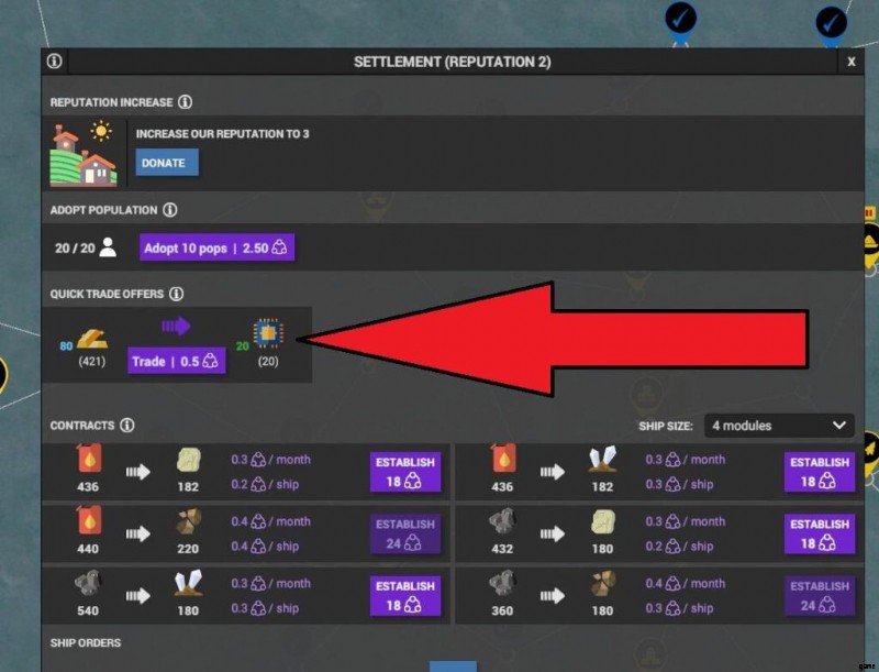 どういうわけかマイクロチップを見つけられなかった、または海に捨てる方法を見つけたとしても、心配する必要はありません。入植地の 1 つで、金をチップに交換する貿易取引が行われています。純粋な経済効率の観点から、これはかなり悪いことに注意してください。あなた自身の生産の金とマイクロチップの比率は 1 対 1 で、この取引は 4 対 1 です。ただし、ゴールドを作成するのにサーバーは必要ありません。この時点で苦労している場合、数百ゴールドで物事を開始するのにわずかな費用がかかります。