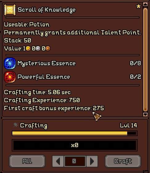 知識の巻物はタレント ポイントを与えます。それらを作成するには、秘密の宝箱を見つけて、神秘的なエッセンスと強力なエッセンスを得るために強力な敵と戦わなければなりません。キャラクターが適切に構築されていない場合、強力な敵は非常に困難になるため、これらの巻物を急いで入手しないでください。これらのアイテムは、本当に必要なときに他の特別なアイテムと一緒に保管することを強くお勧めします。これらのアイテムを失いたくないからです。
