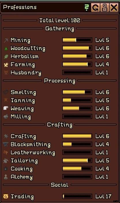これらの職業は、バランスが取れて微調整されているため、早期アクセスに比べて比較的簡単にレベルアップできます。これらの職業をレベルアップするには、その職業に関連するアクションを実行するだけです。製錬をレベルアップするには、製錬可能なものをすべて製錬します。職業をより速くレベルアップするには、後のレベルでロックを解除するアイテムを精錬して、さらに多くの経験を積んでください。貿易以外の他の職業についても同じことが言えます。