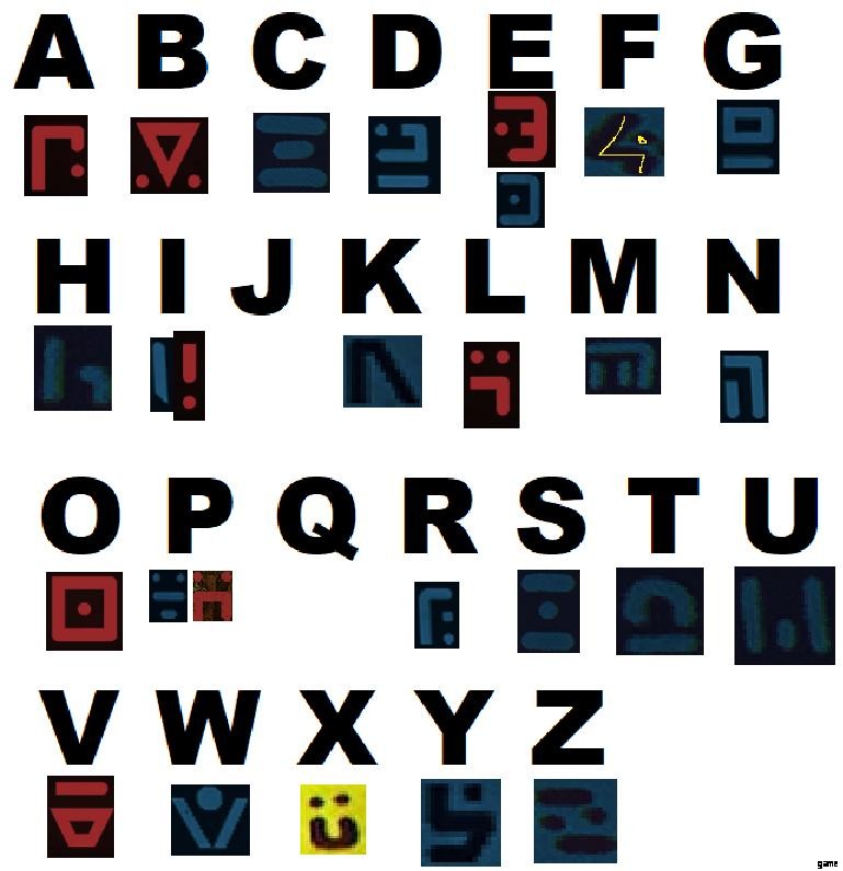 ゲームには少なくとも 2 つの異なる書体/アルファベットが含まれており、1 つは完全に別の言語である可能性がありますが、26 文字中 24 文字を英語の文字として割り出しました。