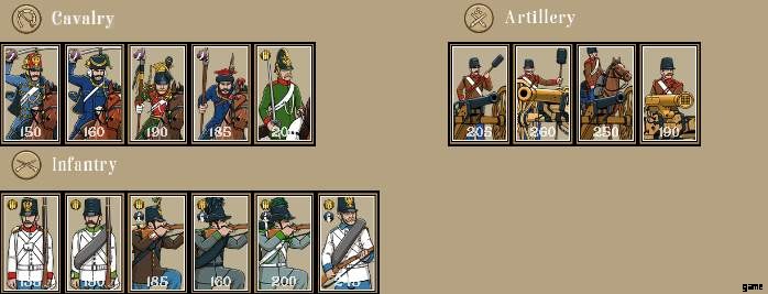 一般的に、砲兵は敵の騎兵に簡単に倒されてしまうため、不利になります。砲兵に費やされた資金は、通常、戦列歩兵または小競り合いの別の連隊に費やされます。とはいえ、オーストリアの砲兵は (ミトラィユーズを除いて) 間接射撃特性を持っています。つまり、味方の部隊やその他の障害物の上に射撃することができます。