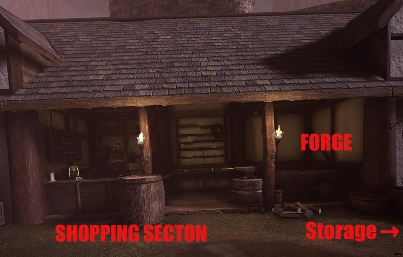 ショップには、アイテムを販売するためのフォージも含まれています。アイテムを放り込むか、プレイヤーは鍛冶場まで歩いてショップ メニューを開いて、在庫から装備を売却することができます。
