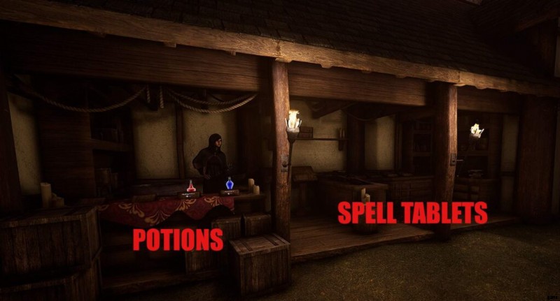 右側はかつて呪文タブレットが提供されていた書見台ですが、執筆時点で存在する魔法システムにより、プレイヤーはメニューのスキルツリータブから直接呪文を購入できます (詳細は後述)。