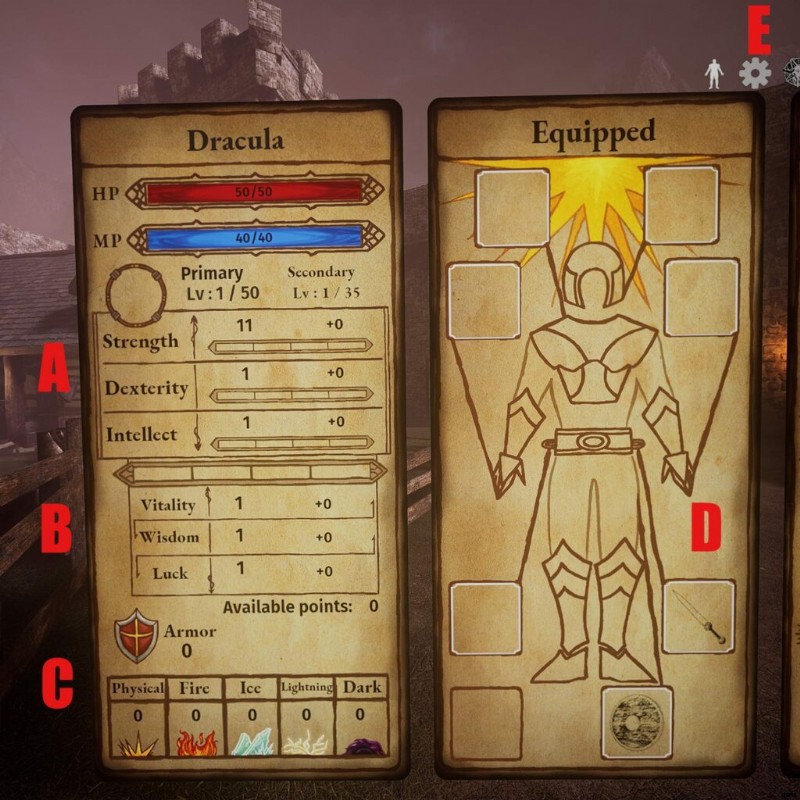 - スキル: スキルと魔法のツリーを表示します。ここで、プライマリ ステータスのレベルアップからポイントを消費します。