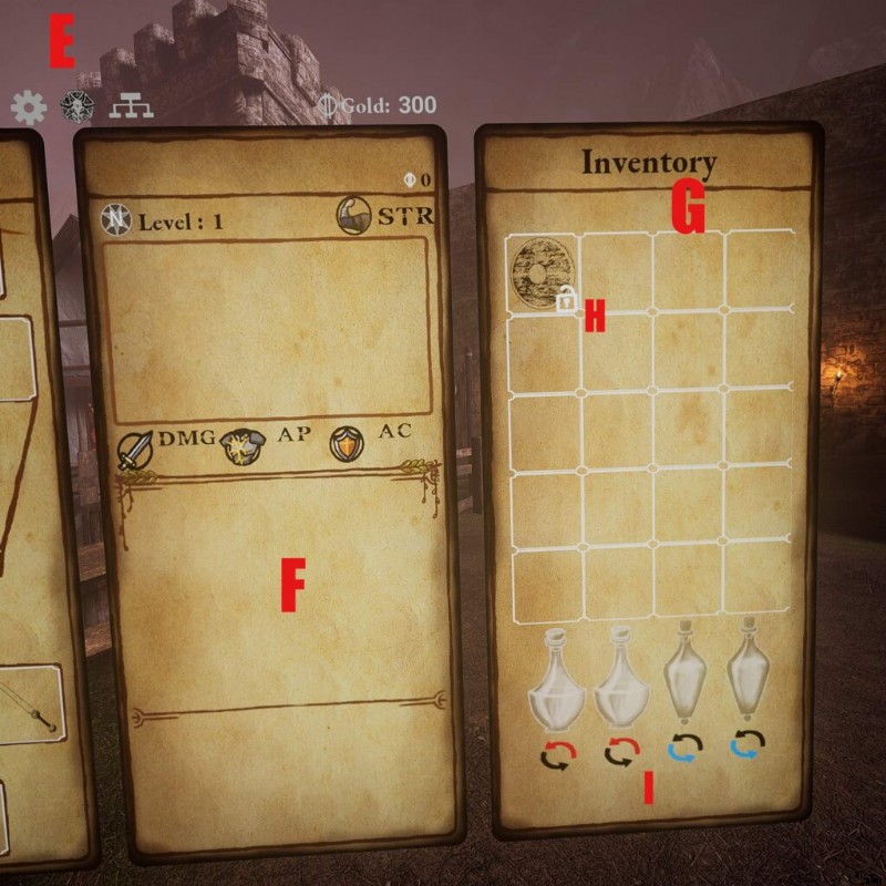 - ホルスターに関する注意:大盾、弓、両手剣は、装備カードの下部に表示されているバック ホルスターにのみ装備できます。
