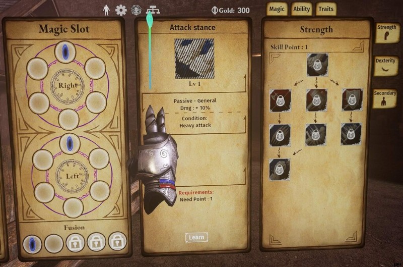 - メニュー カードの上にある [スキル] タブをクリックすると、スキル ツリーが開き、能力をアップグレードしたり、新しい呪文を習得したりできます。 Magic/Ability/Traits タブをクリックしてアップグレードのタイプを選択し、ページの右側にあるオプションからツリーを選択します。