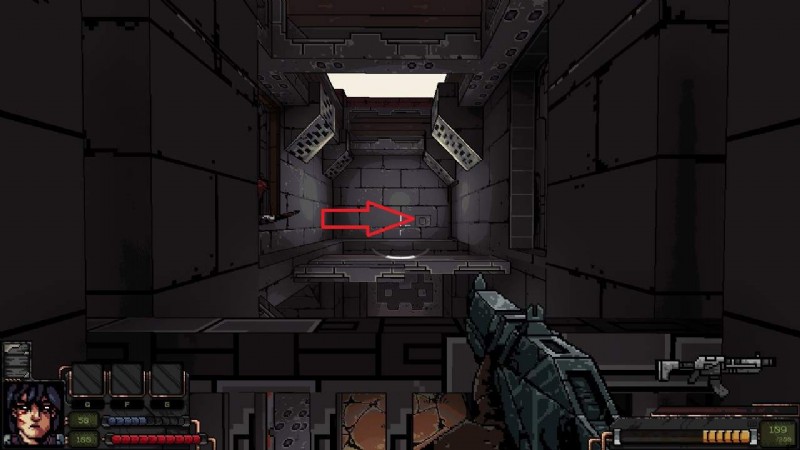 ダクトのすぐ外側に落ちると、2 つの柱ができます。後ろの右のものには隠しボタンがあります。