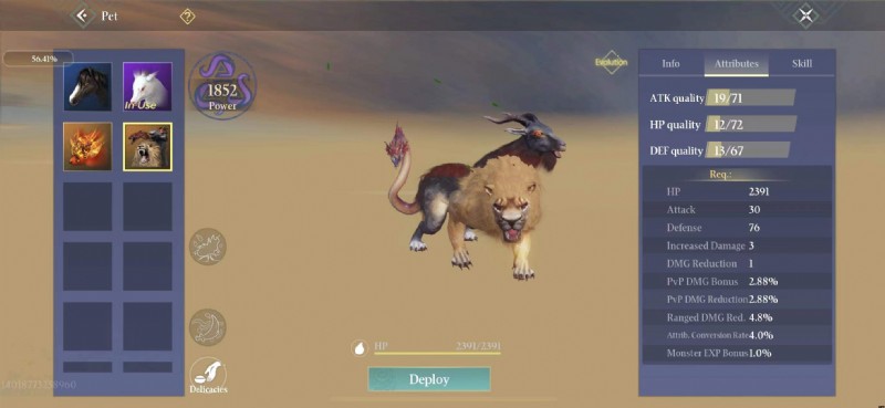 旅行者は自分でキメラを捕獲するか、オークション ハウスからキメラの卵を購入することができます。キマイラの初期のATK/HP/DEF特性は71/72/67です。その最大レベルは 60、血統変換率は 5%、その才能属性 — 遠隔ダメージ軽減は 4.8%、7 つの継承スキル スロットのロックを解除できます。