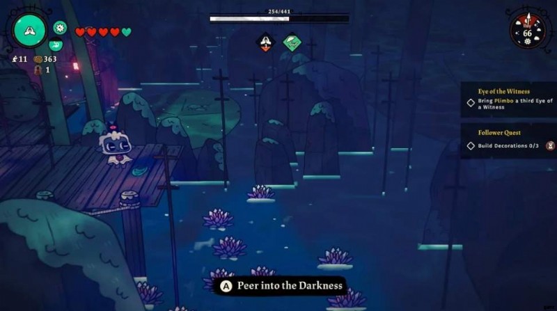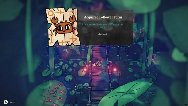 The Wolf Follower Skin can only be gained at the end of a long questline that can begin as soon as you reach Pilgrim’s Passage. Visit the areas in the dead of night, and look along the pier for a green crescent until you can interact with environment to spot a spooky wolf creature in robes. He has four quests for you in each of the areas you unlock, and can only be found at night by the crescent symbol hidden in each place. He’ll ask some pretty crazy things of you like sacrificing followers, and you’ll have to accept to further his questline.