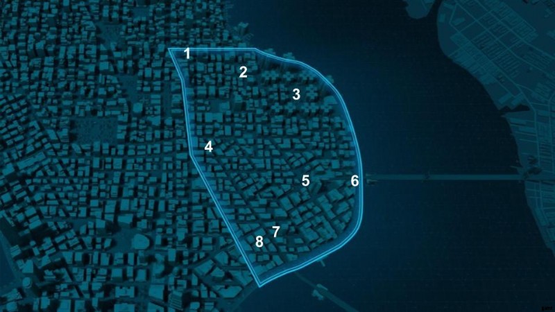 - 通りの下のアーケードにある八芒星に囲まれた円形の噴水