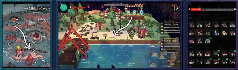 - 巡礼者の通路の場所。魚を釣ると魚の皮が手に入ります。