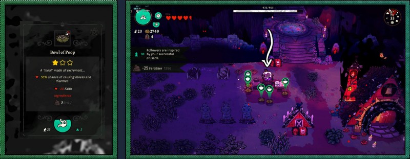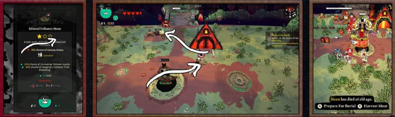 食べ物はキッチンで調理でき、食べ物には対応するカニバルのアイコンが表示されます。材料は、フォロワーの 1 人が老衰で亡くなった場合にのみ入手できます。
