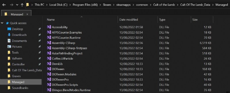 - Cult of the Lamb ゲーム ファイルの「Managed」フォルダにある一致する .dll を置き換えます。