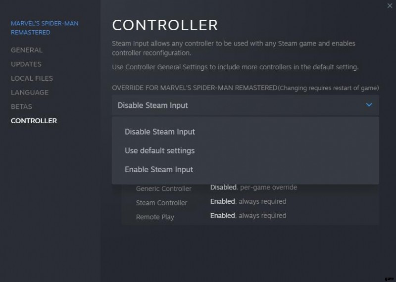ライブラリでゲームを右クリックし、プロパティに移動します。次に、コントローラー タブで Steam 入力を無効にします。