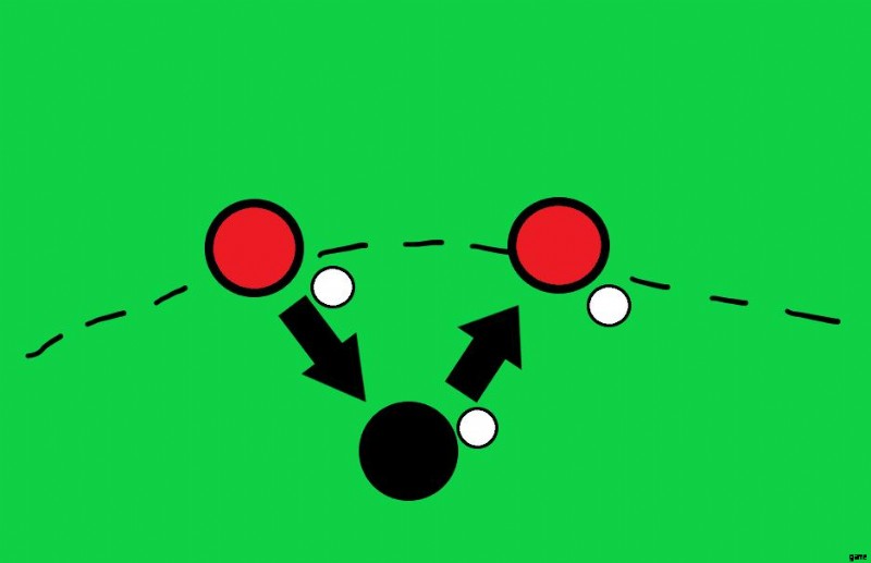 相手に直接ではなく、目の前でパス。そうすれば、ボールが勢いを失うことはなく、相手は速度を落とさずにボールに向かって走ります。ボールを直接受け取り、向きを変えてから走る必要がないためです