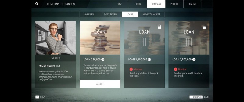 最後のミッションを簡単に完了するには、会社の財務タブから融資を受けてください。