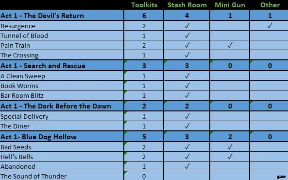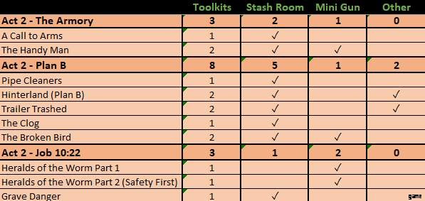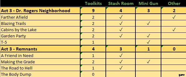 各マップには、ツール キットが必要になる可能性があるロック解除可能な要素があらかじめ決められています。ツールキットの価格はそれぞれ 350 銅です。最初の 3 つの法律の要件を以下に掲載します。エクストラ ツール キットを使用すると、応急処置キャビネットで無料のヒールをアンロックできます。キャビネットに追加のツール キットを使用すると、銅貨が 50 節約できます。ツール キットを無駄にすると、350 銅がかかります。