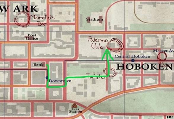 銀行を脱出するときは、以下のルートに従ってください。パレルモ クラブに着いたら、車を降ります。警察が混乱するはずです。次に、必要なシンボルが消えるまで待ちます。