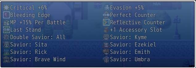Kymeが唯一のパーティーメンバーである場合、カウンターステータスをできるだけ長く維持することは、敵をゆっくりと倒すか、パーティーメンバーを復活させるために時間を稼ぐための実行可能な戦略です.これには、敵が物理攻撃を使用する場合は +1 カウンター持続時間の剣、または魔法攻撃を使用する場合はスピリット チャーム アクセサリーが必要です。無料のカウンター/リフレクト マジック ターンでは、Kyme は回復を使用して失われた MP を回復したり、その他のほとんどのことを行うことができます。
