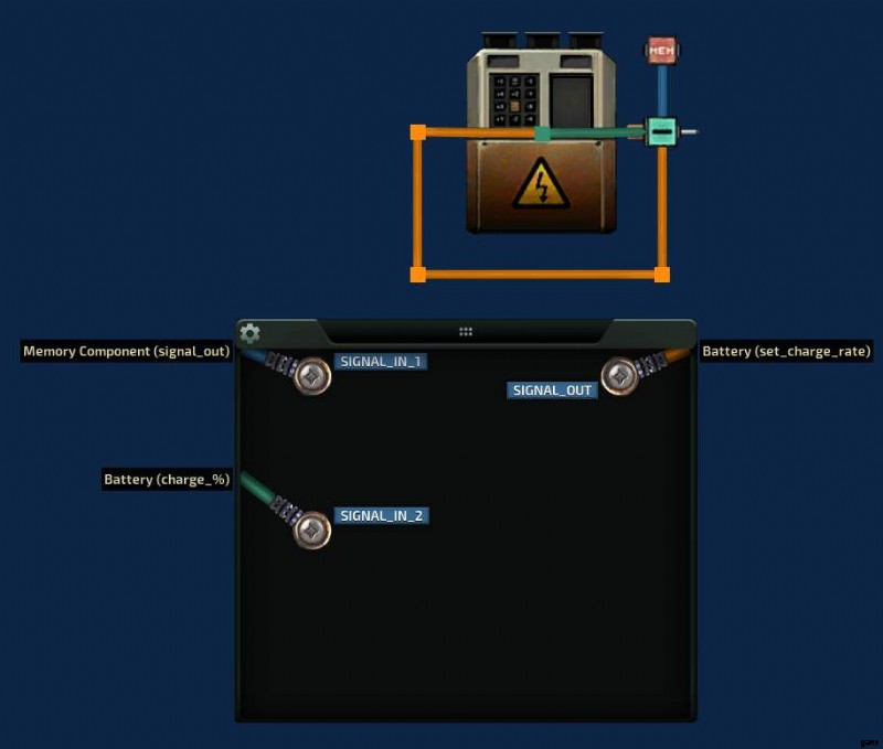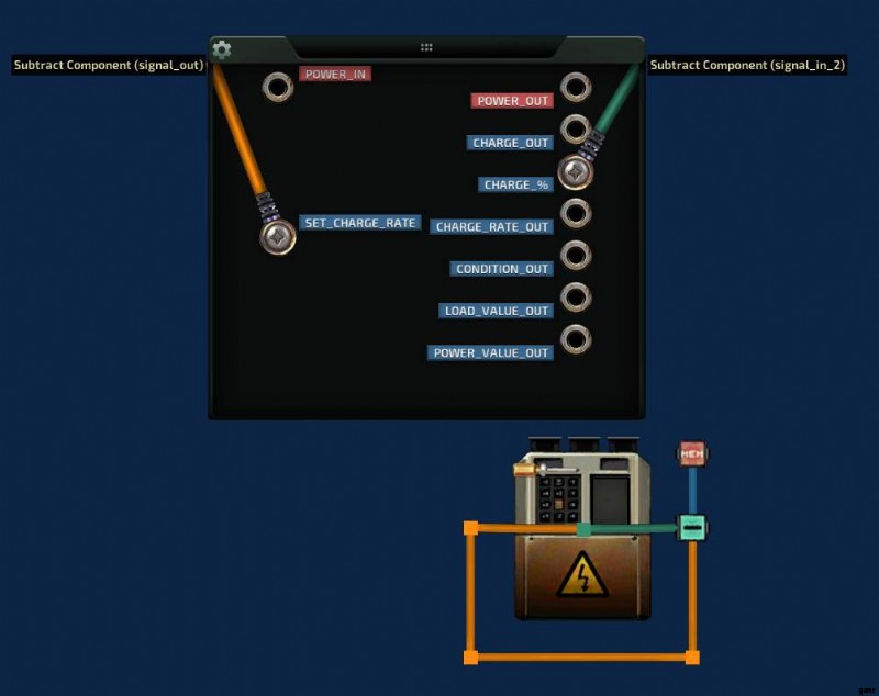 見えませんが、減算コンポーネントは次の式を実行するだけです:入力 1 – 入力 2 =出力。このコンポーネントの出力をバッテリーに送り返して、バッテリーの充電速度を設定します (最初の画像を参照してください)。
