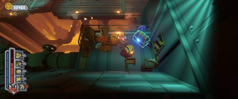 - 左:真ん中のピットから少し左です。大きなロボットが空中を流れています。これを叩いて、この胸をそれぞれ壊してください。