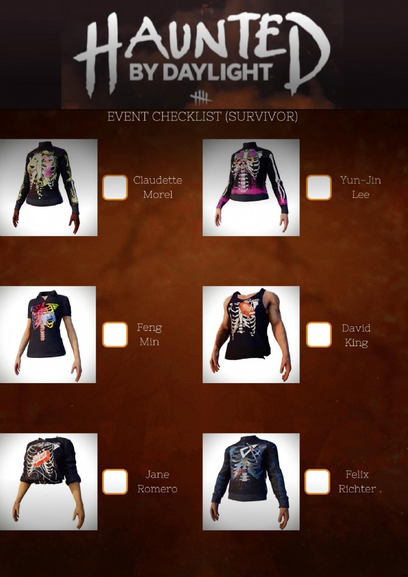 早速、イベント アイテムのチェックリストを示します。 1 つは殺人兵器用、もう 1 つはサバイバル シャツ用です。