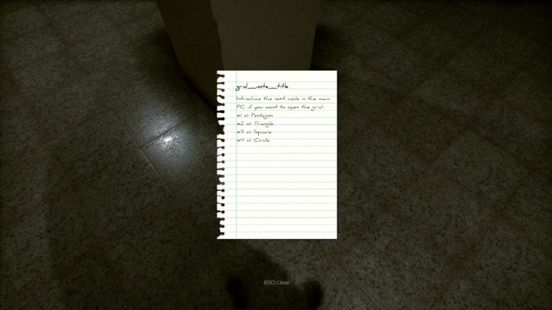 プールを通り抜けた後、次の部屋に入ります。通常のエンディングに到達する前に、最後の部屋につながる赤いドアが表示されます。このドアを通ってはいけません。代わりに地面を見ると、後でこの成果を達成するための正しい方法につながるゲートが表示されます。まず、この部屋の地面にもあるメモを探す必要があります。新しいコードの記号の順序がわかります。