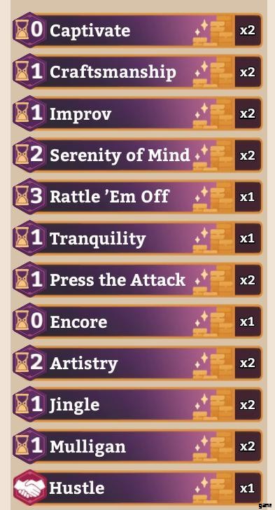 あなたの最初の目標は、できるだけ早く Rattle 'Em Off をヒットすることです。 Captivate と Jingle でターンを延長し、必要に応じて Encore を使用し、Serenity of Mind でさらにカードを引き、Attack/Scheme と Improv を押します。