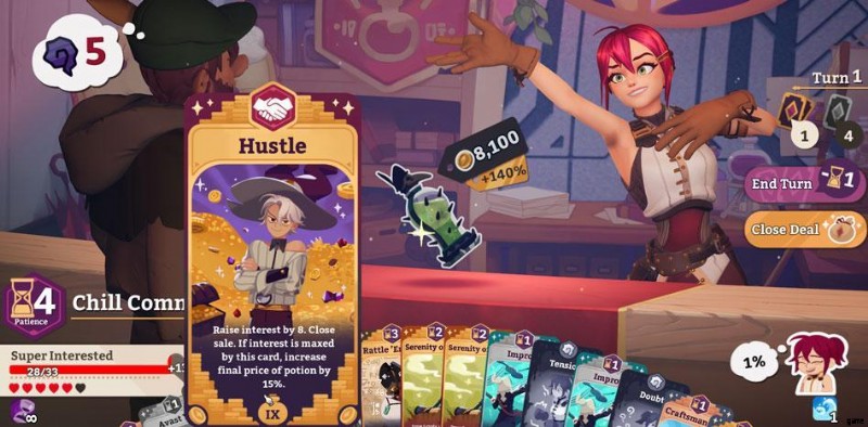 無限の忍耐力が得られたら、最大の興味に達して終了を余儀なくされる前に、クラフトマンシップと芸術性をできるだけ高く積み上げることを目標とします。 15 + 5 (Closer) パーセントのボーナスを得るには、必ず Hustle で終了してください。