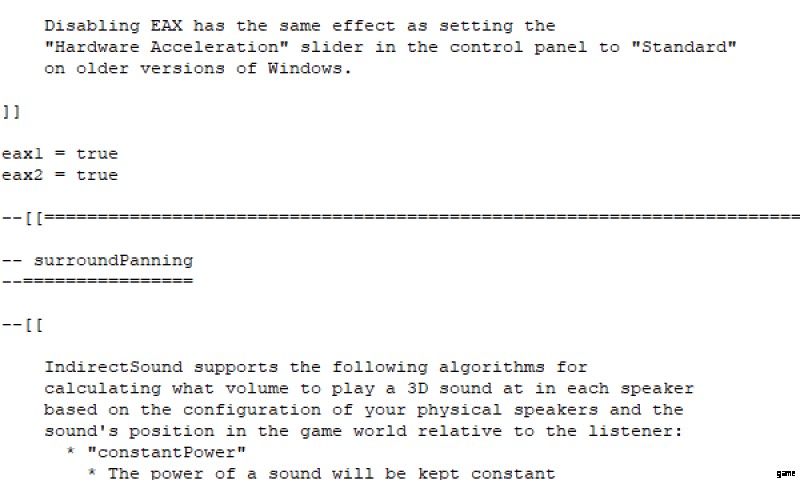 ここまで来たら、おめでとうございます。これが最後のステップです。抽出した dsound.ini ファイルをメモ帳などのテキスト エディターで開き、Ctrl+F を押して "eax1" (引用符なし) を検索します。 「eax1」と「eax2」の両方の値を「true」となるように編集する必要があります (以下に示すように)。メモ帳を閉じる前に、忘れずにファイルを保存してください。