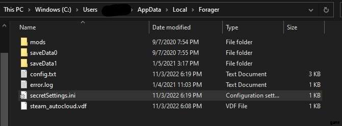 シークレット設定にアクセスするには、C:\Users(your name)\AppData\Local\Forager に移動します。これは別のドライブにある可能性がありますが、AppData/Local にあります。次に、Forager を閉じた状態で、secretSettings.ini を開いて以下を変更します。