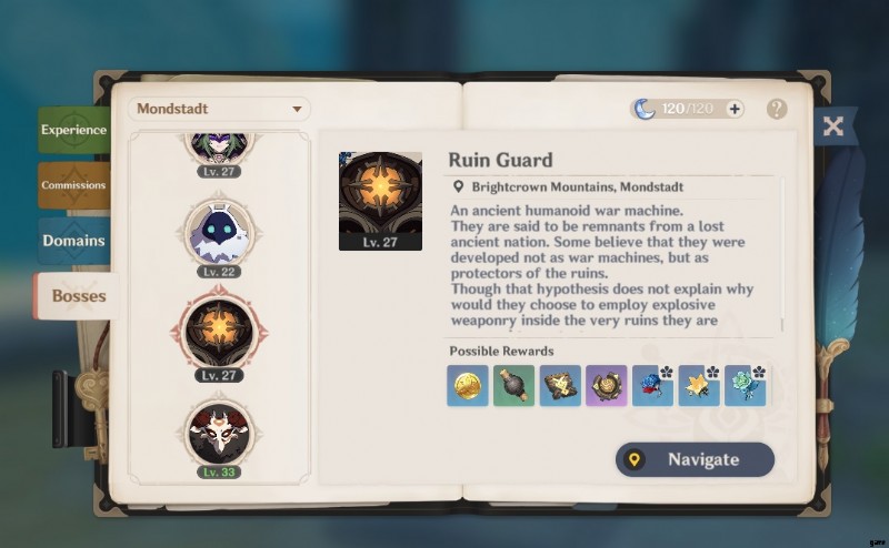 冒険者のハンドブックを取得すると、これらのボスの場所をパイと同じくらい簡単に見つけることができます.あなたがしなければならないのは、冒険家のハンドブックのボスタブに行くことだけです。現在、この部分は、倒そうとしているボスによって異なります。 Ruin Guards は Mondstadt 地域にあります。