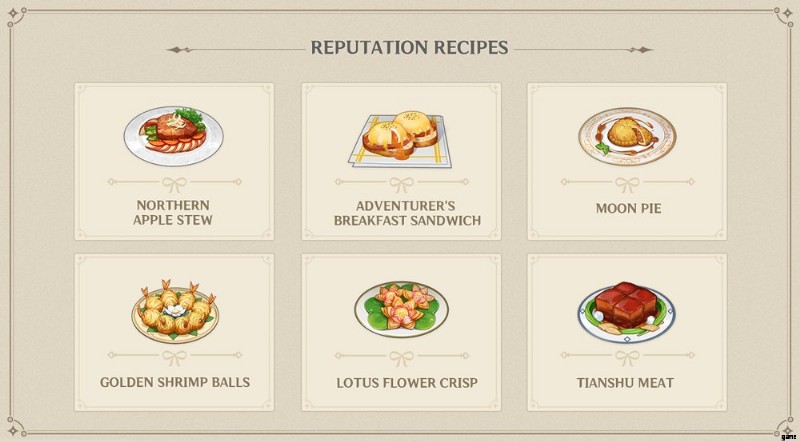Namecards と非常によく似ており、特定の評判レベルで、プレイヤーは料理するための新しいレシピを授与され、両方の地域でロックを解除できる限定レシピが提供されます。