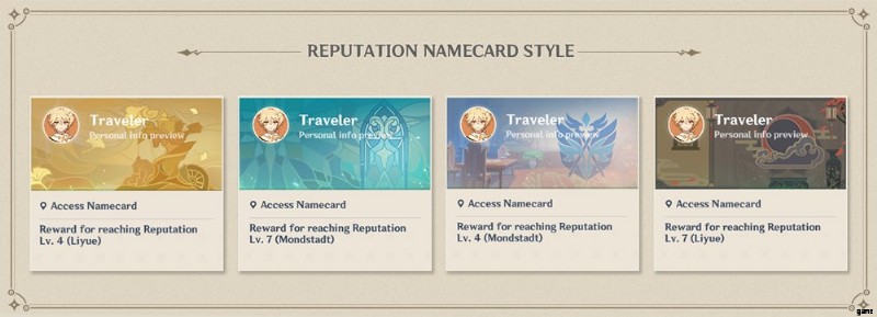 特定の評判レベルに達すると、一部のネームカードのロックを解除できます。 miHoYo がゲーム内アンケートで得たフィードバックは、人々が Namecard を望んでいたことを意味していたに違いありません!レベル 4 と 7 の両方の地域で、ネームカードが与えられます!