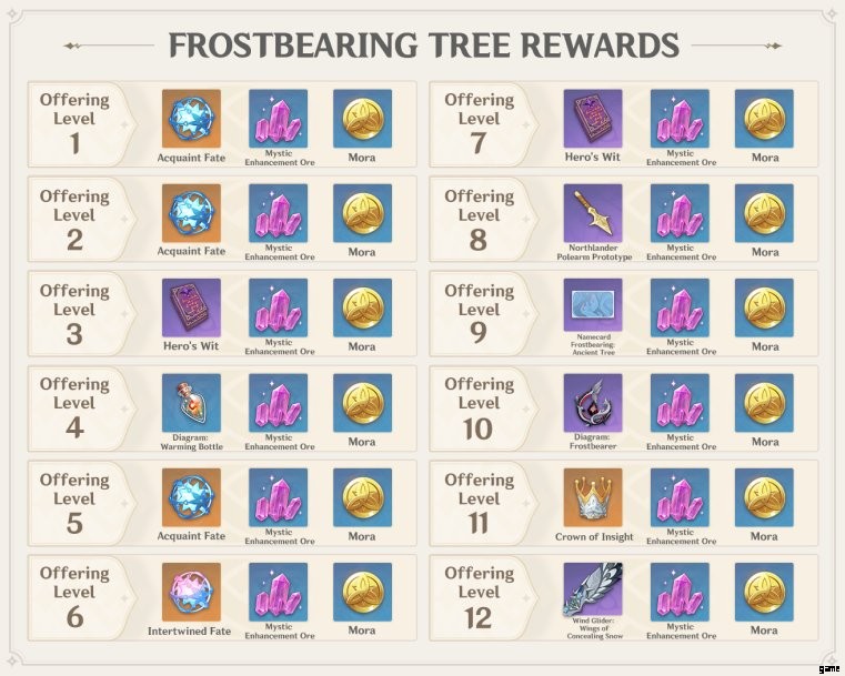 Frostbearing Tree の 12 レベルのすべての報酬は以下で確認できます。