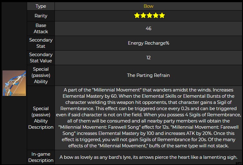 その特殊能力「The Parting Refrain」は、主に Elemental Recharge と Elemental Mastery を増加させます。この武器を使用しているキャラクターがエレメンタル バーストを 4 回敵に当てると、近くにいるすべてのパーティー メンバーの攻撃力が 20% 増加します。