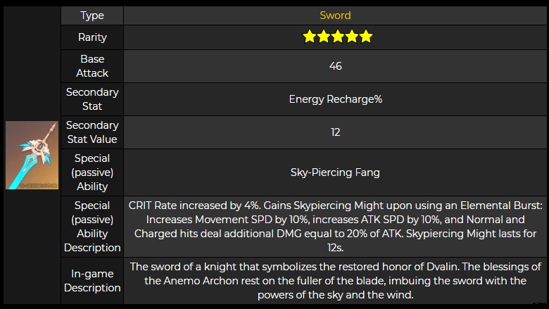 特殊能力「空を貫く牙」でクリティカル率が4%上昇する。この武器を使用するキャラクターがエレメンタル バーストを使用すると、剣は移動速度を 10% 増加させ、攻撃速度を 10% 増加させ、通常ヒットとチャージ ヒットの両方のダメージを攻撃力の 20% に増加させます。