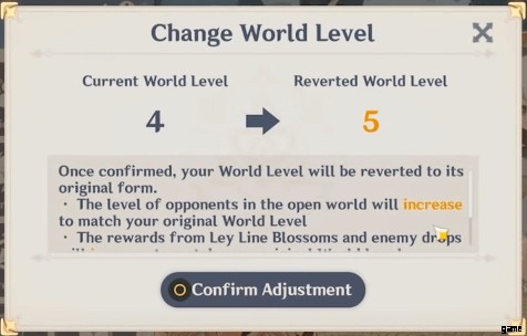 [ワールド レベルを元に戻す] をクリックすると、これから行う変更を示す別のテキスト ボックスが表示されます。これらの変更を確認すると、ワールド レベルが 1 つ下がり、全体的な難易度がはるかに簡単になります。