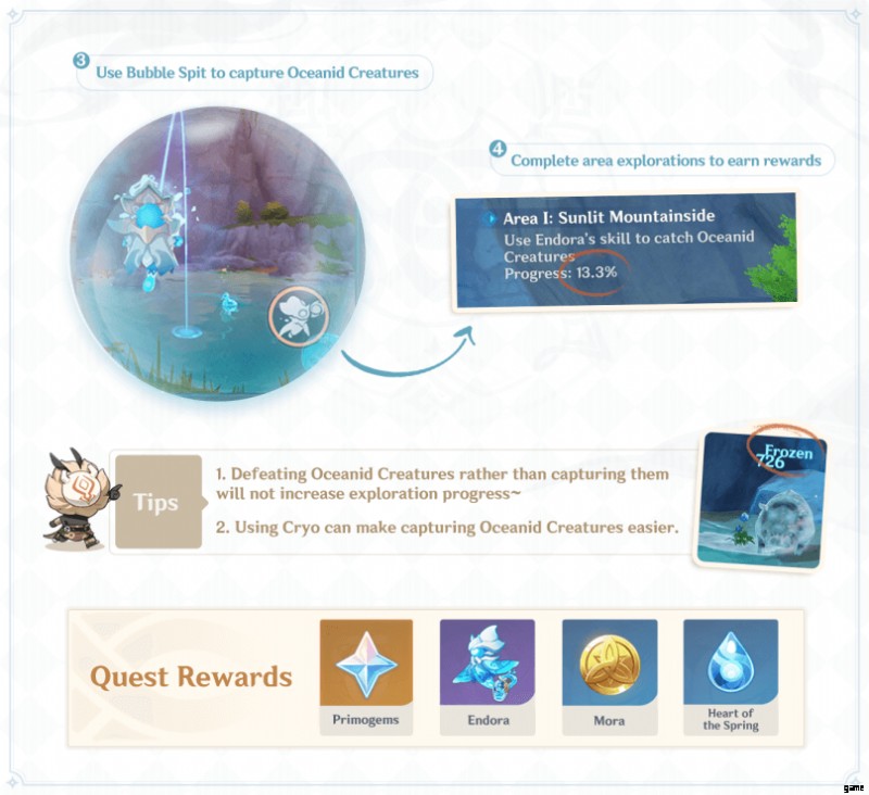 最初のフェーズでは、特定のエリアに向かい、エンドラのバブル スピット スキルを使用します。 (あなた自身のエレメンタルスキルを置き換えます)これらのエリアの水の生き物を吸収します。この 2 つのスキルはいつでも切り替えることができます。バブル スピットを使用するには、エレメンタル スキルを使用するときと同じボタンを押します。長押しすると距離調整ができます。