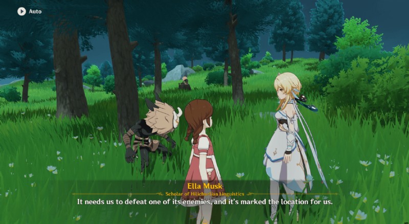 Dunyu RuinsとTianqui Valleyの中間点でCurious Hilichurlを見つけてください.好奇心旺盛な Hilichurl は本当にあなたと友達になりたがっていますが、最初に近くにいる手ごわい敵を倒すように頼んでいます。実際には Fatui Harbingers の形をした複数の敵です。 (元素反応を準備してください!)。