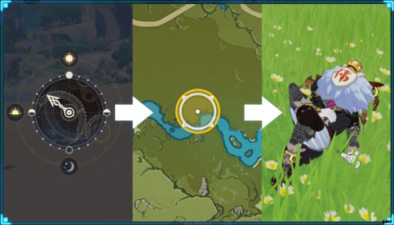 次に、Dragonspine 地域のすぐ北にある Perplexed Hilichurl と話します。ファトゥイ ハービンジャーの群れを倒すと、「アバ モシ ダダ」が与えられます (起床から昼食まで) 今日の異常な Hilichurl の出会いのために。地図上でマークされたエリアに行き、時計を 06:00 から 12:00 の間に回してください .