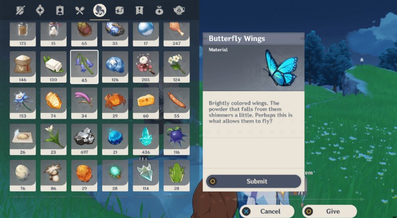 オース岬の頂上近くにいる懐疑的なヒリチャールは「ウパノ」を欲しがっている これは、紛らわしい用語として言語ハンドブックに記載されています。 「ウパノ」という言葉は空気や飛行中の物体に関連しているため、かつて飛んだバッグの中にあるものすべてであると考えて間違いありません。 懐疑的な Hilichurl には望ましい (Butterfly Wings で行った) )。
