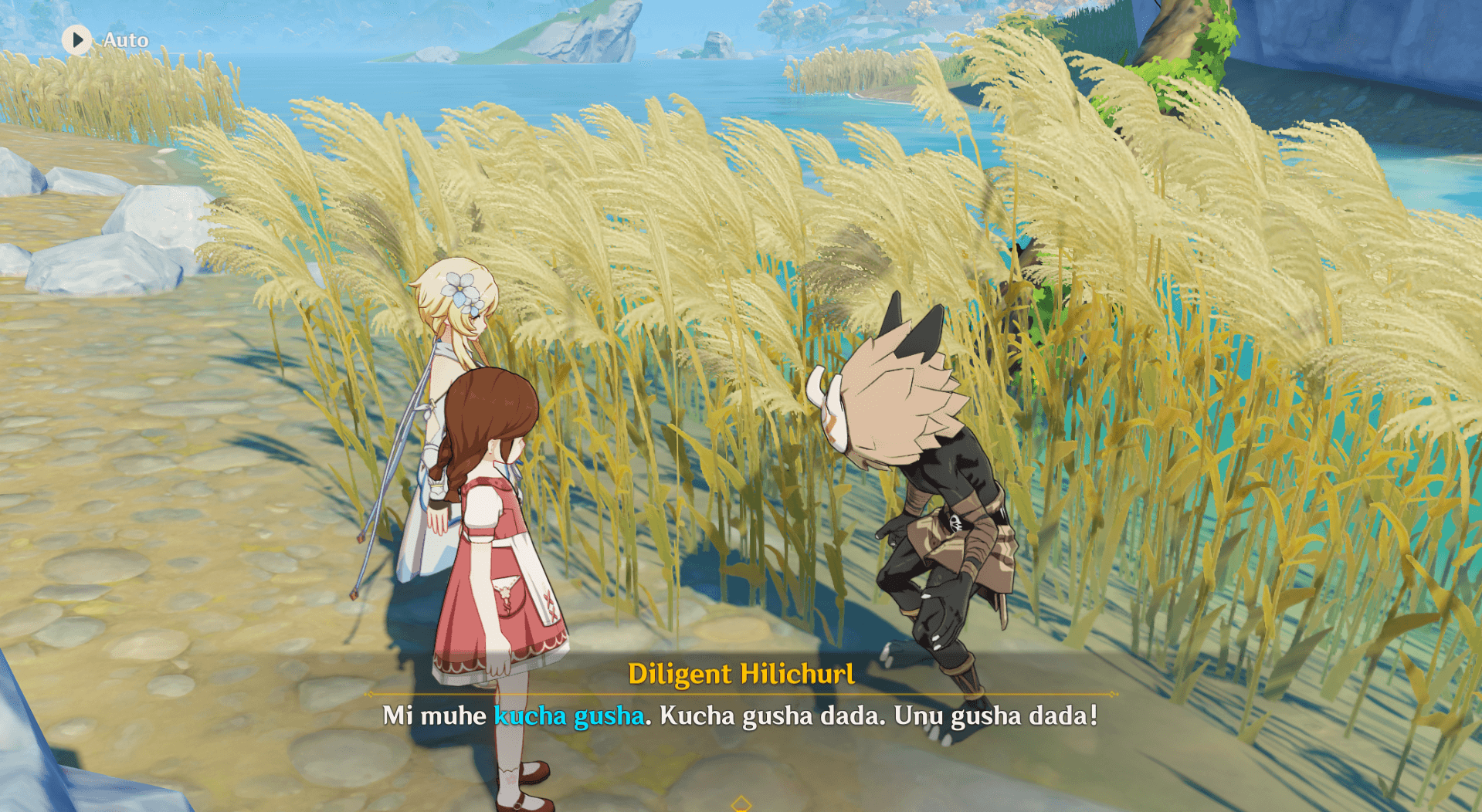 エラとチームを組んだ後、あなたとコミュニケーションをとることをいとわない Hilichurl に導かれます。このヒリチャールは、真夏の中庭の真上にある崖に一人で立っています。 . Hilichurl はお腹が空いていると説明し、「水の中の肉」を意味する「Mita movo lata」を要求します。 ヒリチュルに魚をあげる 、そして彼は喜んで別の Hilichurl への道を示し、より多くの情報を提供します.