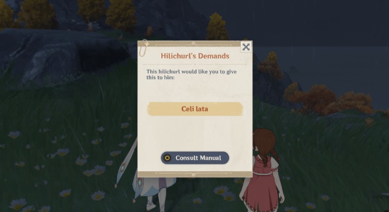 Qingce Villageのすぐ南西にあるBishui Plainで最初のHilichurlと話す .この落ち着きのないヒリチャールは、"gusha celi boya" を望んでいます これは、「赤い果物または野菜」に大まかに翻訳されます。 トマトやジュユン チリなど、この要件を満たすものなら何でも彼に与えることができます。