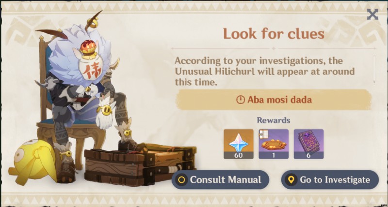 とらえどころのない珍しい Hilichurl に関する情報を追跡するには、Ella Musk や他の地元の Hilichurl の助けを借りる必要があります。 Hilichurls の簡単なリクエストを完了すると、Unusual Hilichurl を見つけることができる時間と場所が示されます。これらの時間に異常な Hilichurl を倒して、報酬を獲得してください。