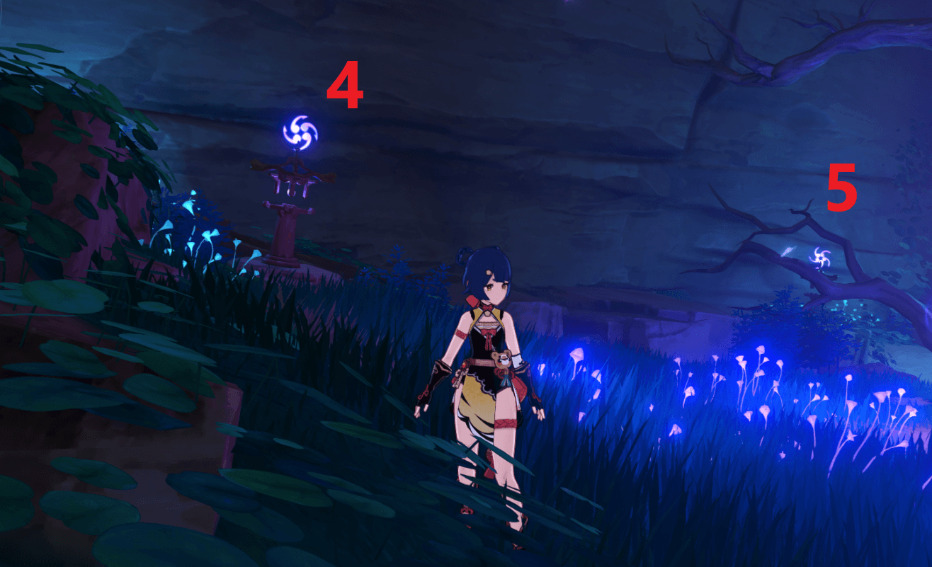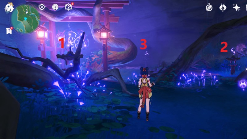 部屋の中を反時計回りに移動しながら、部分的に隠れている祠は無視してください 支店によって。屋外にある次の祠に直行し、4 に設定します .その後、最後の祠に戻り、5 とマークします。 .