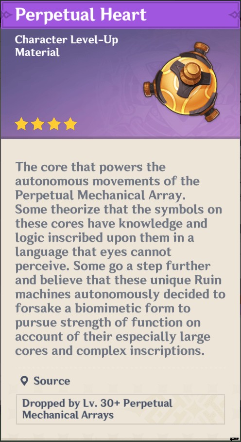 永遠の心 原神インパクトの4つ星素材です 、パーペチュアル メカニカル アレイを倒すことによってのみ取得できます イナズマで。
