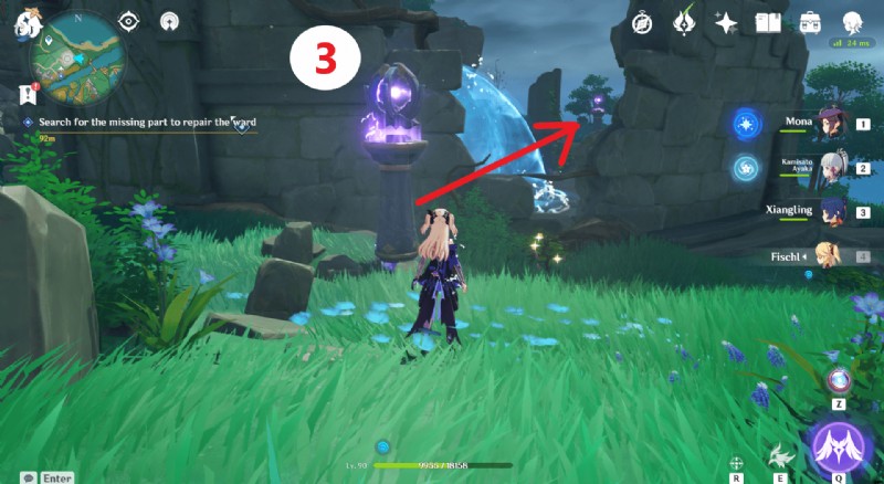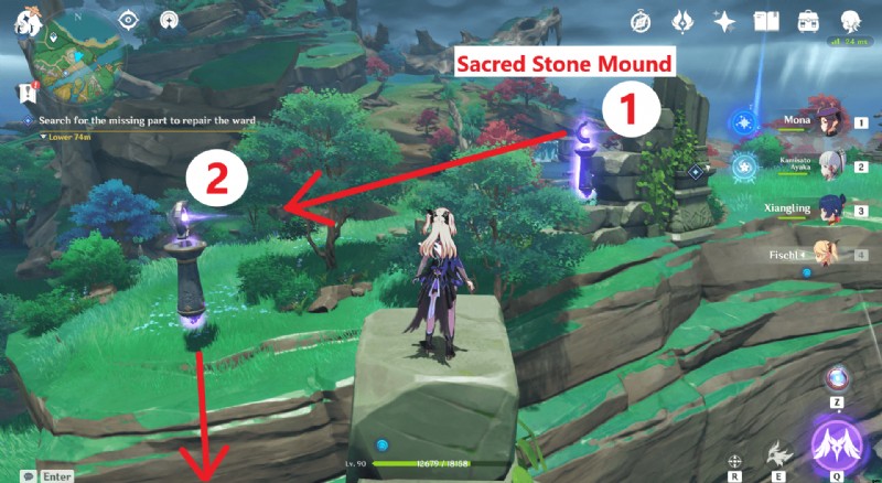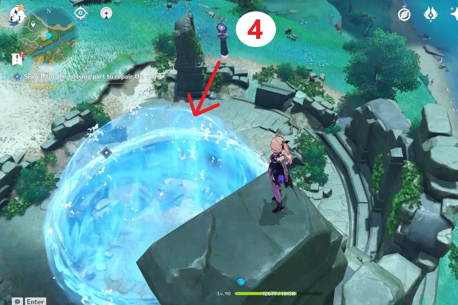 このクエストシリーズの最初の部分では、「奇妙な石灯籠」を観察し、再び点灯させる方法を見つけるよう促されます. Elemental Sight を使って渦巻く紫色のライトをたどって病棟に向かい、パズルを完成させてください。