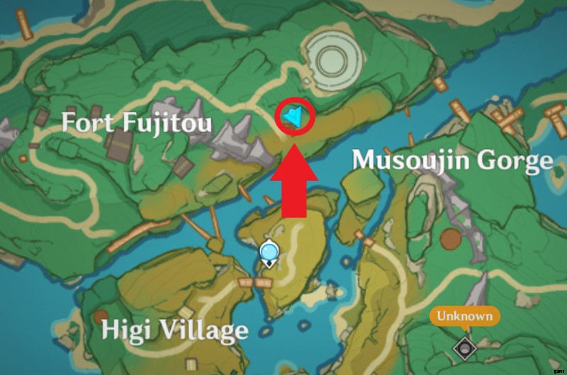 ヤシオリ島の梶と話す オロバシの遺産をトリガーする .彼の居場所は下の地図に示されています: