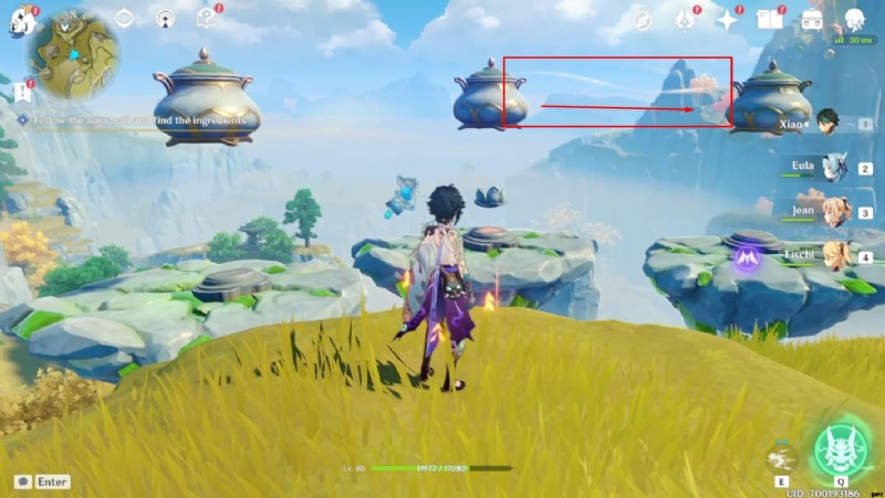 3 つのうち中央のポットを見ると、特定の方向に流れる風がそこから発せられていることがわかります。これは従わなければならないオーラですが、一般的な風と間違えられがちです。グライダーを使って、風のオーラがどこに向かっているのかを追ってください。最終的に、数匹の Anemo Slime の犯人が表示されます。